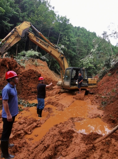 隨后,市政集團(tuán)搶險(xiǎn)救援突擊隊(duì)接到了搶修澄邦村村道的任務(wù),短短5公里3米寬的村道,每幾十米就有一個(gè)坍塌,大型的拖車(chē)無(wú)法將挖掘機(jī)運(yùn)送至村里進(jìn)行搶險(xiǎn)救災(zāi)。經(jīng)過(guò)突擊隊(duì)現(xiàn)場(chǎng)研究,制定了采用小型挖掘機(jī)一邊先行搶修道路一邊往澄邦村前行的方案,最后挖掘機(jī)用了5小時(shí)到達(dá)村里開(kāi)始搶險(xiǎn)工作。