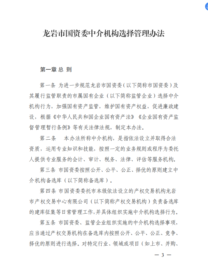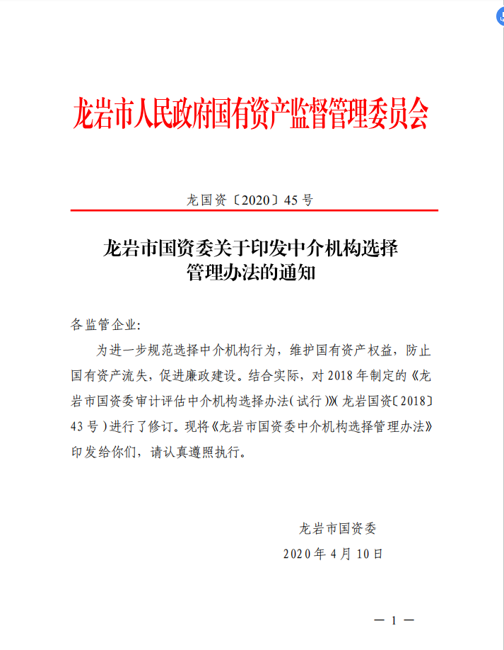 龍巖市國資委關于印發(fā)中介機構(gòu)選擇管理辦法的通知(龍國資[2020]45號)